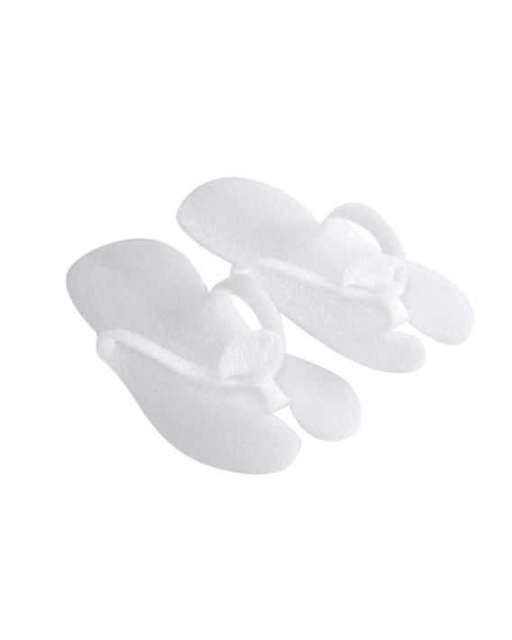 Jednorazowe klapki japonki wykonane z lekkiej i wygodnej pianki w kolorze białym. Pakowane po 10 par, idealne do zachowania higieny i komfortu klientów.