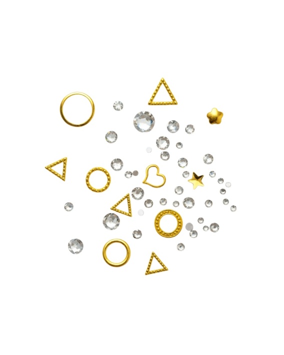 Dodaj swoim paznokciom luksusowego blasku dzięki eleganckiemu zestawowi złotych ozdób do manicure z cyrkoniami. W komplecie znajdują się różnorodne kształty 3D: trójkąty, kółka, serduszka, gwiazdki oraz błyszczące kryształki w wielu rozmiarach.